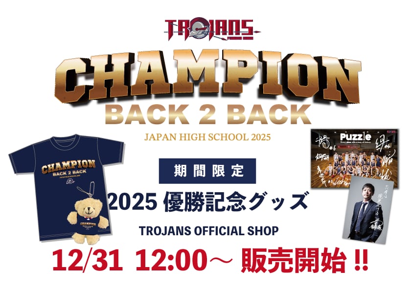2025 CHAMPION POST CARD 2025年、冬の熱狂をポストカードに。 連覇を達成したTROJANSメンバーのサインやロゴをあしらった、ポストカード3枚セットです。 #01 【CHAMPIONS】メモリアル・コラージュ 決勝戦の興奮を一枚に凝縮したメインビジュアルです 中央に立つ片峯聡太監督を中心に、激闘を戦い抜いた選手たちの躍動感あふれるプレーシーンを配置しました。上部には「BACK 2 BACK」の文字を掲げ、連覇という偉業を成し遂げたチームの団結力を象徴しています #02 【 Puzzle】チーム集合写真&直筆サイン 「Every piece tells a story of victory.(すべてのピースが勝利の物語を語る)」というメッセージが込められた、体育館でのチーム集合写真に、3年生ベンチメンバーのサイン入り!! 一人ひとりが欠かせない「ピース」となり、パズルを完成させるように作り上げたチームの集大成を表現しています。 (直筆サインはプリントです) #03 【志向は現実化する】片峯聡太監督サイン入り チームを連覇へと導いた片峯監督の強い信念を表現した一枚 片峯監督のポートレートに、座右の銘である「志向は現実化する」という言葉とサインを添えました。夢を現実に変えるための、揺るぎない覚悟と情熱が伝わる特別なポストカードです #裏面(3枚とも共通) ポストカードの裏面は、全3種共通で、福大大濠バスケットボール部の連覇達成を祝したデザイン。中央には、連覇(BACK 2 BACK)を証明する重厚なゴールドロゴを配置。日本高校バスケの頂点に立った証を表現。 共に激闘を勝ち抜いた全登録選手、コーチ陣、スタッフの名前が一つひとつ刻まれています。さらに「& All TROJANS FANS」として、応援してくださったすべてのファンの皆様への感謝も添えています。 ■ 注意事項 ・商品の色味は実際の色と異なる場合がございます。予めご了承ください。 また、完全受注生産のため、決済完了後のキャンセルは出来かねます ■ 発送・注文に関する情報や注意事項 ・1月末頃〜順次発送 生産の都合により発送が遅れる場合がございます 予めご了承ください ※決済前に入力内容を必ずご確認ください※ ・注文確定後のキャンセルは一切行なっておりません サイズをよくご確認の上ご購入ください ・ご住所入力ミスによる変更・再発送も行なっておりません ご不明な点やご質問がございましたら、 [email protected]までお問い合わせください。 ※12/31〜1/4までのお問い合わせは、1/5以降順次対応 (1/5以降は5営業日以内に対応)
